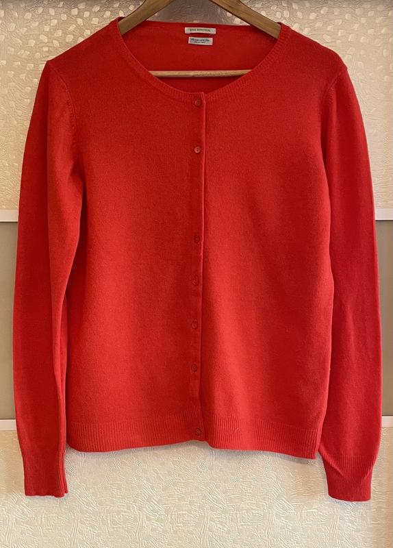 Жіночий светр розміру M-S. Або підлітковий. Відомої італійської фірми. Шерстяний. Тонка в‘язка. Спереду на ґудзики. Два ґудзики втрачено. Вказано на іото і враховано у ціні. Колір червоний. Виріз горловини круглий. Стан дуже добрий. ПО грудей 47 см Довжина виробу 54 см Довжина рукава 69 см Плече 11 см