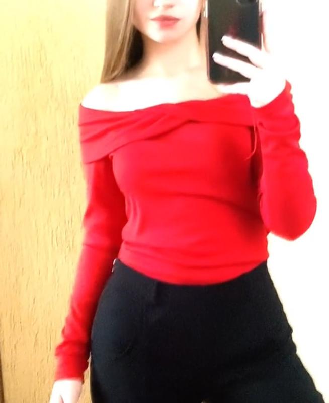 Червоний светр з відкритими плечима