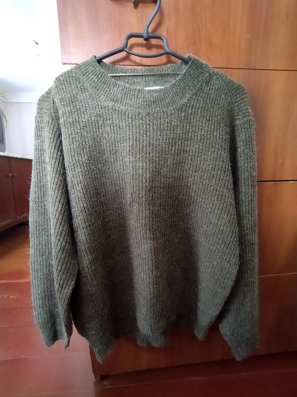светр жіночий з рукавом опущеним. колір більш насичений хакі. рукав пишний на патенті. півхват грудей 55 см, довжина рукава від горловини 61 см, довжина виробу 60 см. без дефектів