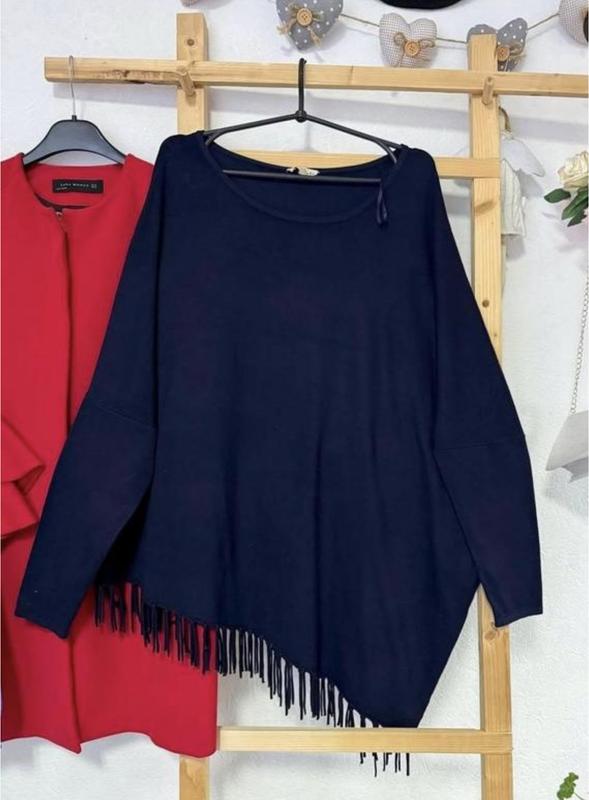 Классный асимметричный свитерик, состояние новой вещи, ткань приятная, не жаркая, идеально на сейчас Тканина тягнеться Грудь 140-150 Бедра 160 По бокам разрезы Цвет темно синий ближе к черному