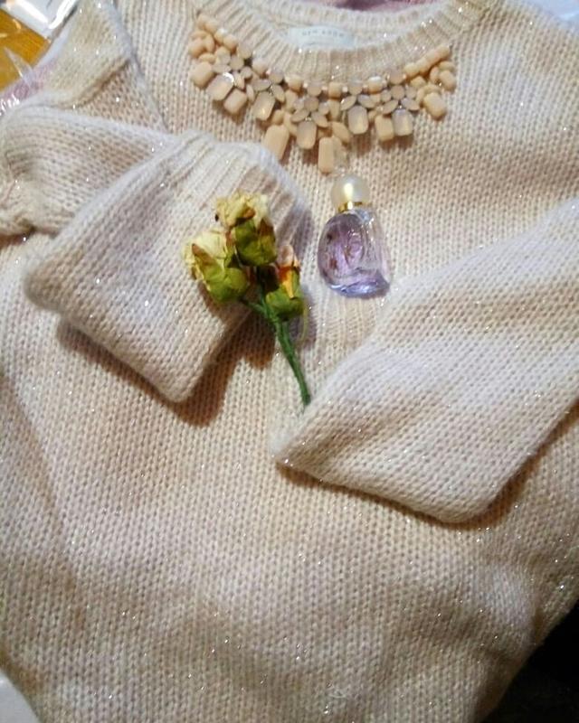 Пудровый свитер с украшением вокруг шеи,есть небольшой нюанс(небольшая за тяжка на груди,ее не заметно,последнее фото)