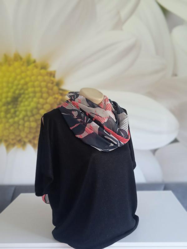 Класична однотонна кофтинка з коротким рукавом чорного кольору. Злегка прикрашена люрексом. Легка та зручна. Приємна до тіла. Гладка машинна в'язка. Нитка середньої товщини, більш до тонкої. Тягнеться з легкістю. Лягає вільно. Фасон-легка летюча миш. Акуратний виріз. По плечах невеликі розрізи. Стильно виглядає з шарфом в тон у комплекті (шарф може бути замінений, але в кольорі). Є розміри.