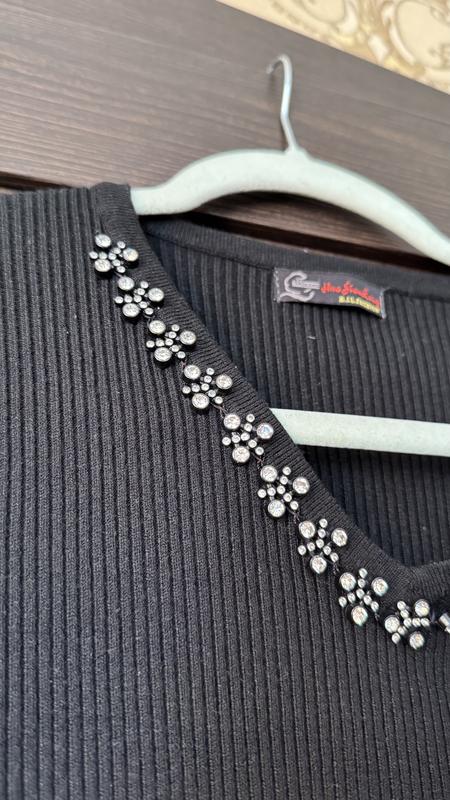 Чорна кофта/ светр в рубчик з камінчиками Приємна на дотик Плотний матеріал, не просвічується Декор добре прикріплений до светра Розмір S/M Довжина Светру 55 см Напів обхват грудей 38 см Довжина рукава 53 см