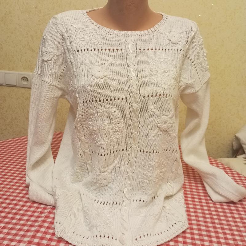 продам вінтажний светр, від Cardyv.Taylov або лонгслив ,або кофтину білого кольору в ідеальному стані. Має дуже гарний склад :50% нитка кропиви, /ramie/, 40 cotton, 10 віскоза. Довжина виробу 67, ПОг 56, довжина рукава 59., ширина по низу 56.