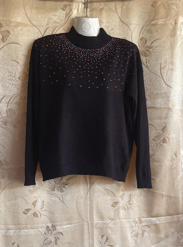 чорний жіночий брендовий джемпер, під шию, оздоблений , пог-52, поб-51, довжина-56, 87% віскоза, приємний на дотик
