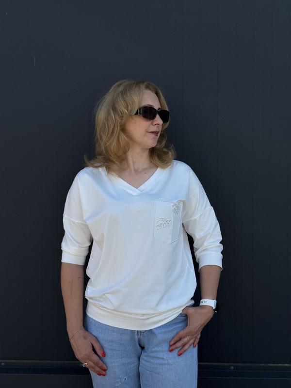 В наявності. Колір: білий. Рукав три четверті має патент. Розмір Оверсайз по 52 розмір. Довжина : 69 см Обʼєм грудей : 65•2
