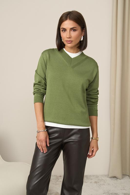 Оливковий светр з v образним вирізом з преміальної віскозної пряжі