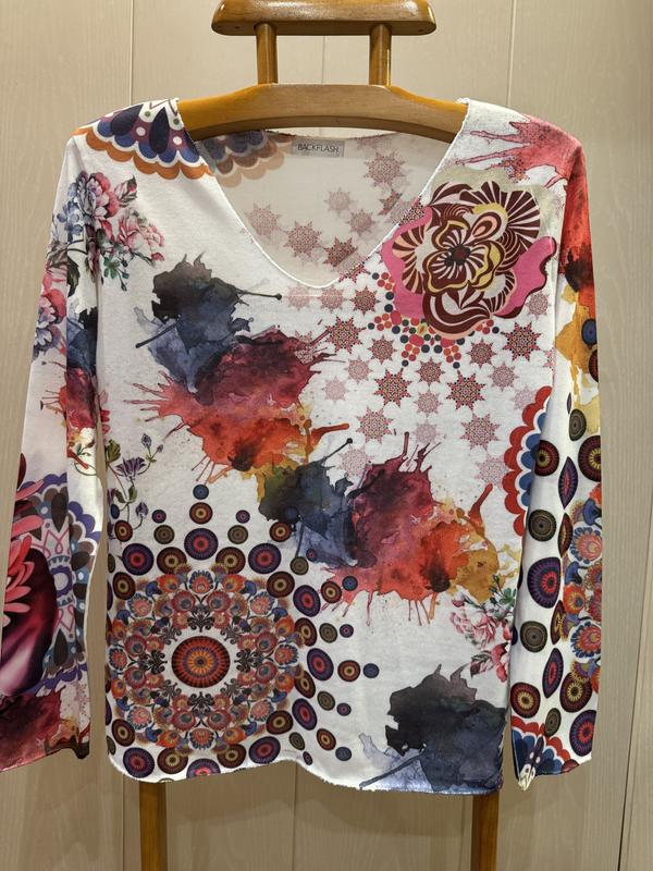 У наявності красива італійська кофточка фірми BACKFLASHP. Розмір вказаний 8, але за вимірами більше йде на 12. Склад: 95% котон і 5% еластан... тканина м'яка, приємна до тіла та добре тягнеться. НОГ-51...добре тягнеться до 60, довжина-63, плечі-42, довжина рукава-58, ширина по низу-50+ще добре тягнеться.