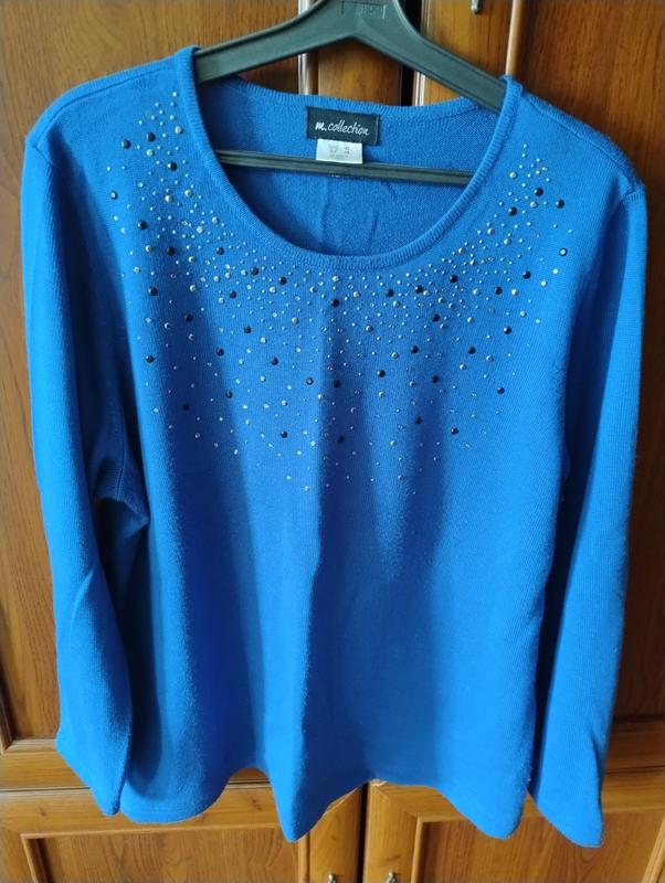 Свитер насыщенного василькового цвета мягкий приятный к телу хлопок Длина 65см.ПОГ-63см.цвкавые стразы с переда слушайте украшением изделия.Рукав 3/4.