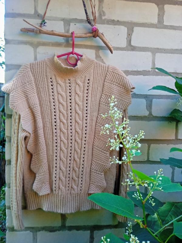 бежевий светрик, красивий теплий колір,ажурний візерунок, крильця волани , м'який, легкий , в складі віскоза та поліестер, длина 62,пог 54,плечі. 45_46,рукав рукав 63_64, по внутрішній стороні 36,низ 44,стан та якість гарні без нюансів , колір реальний як на останніх двох фото