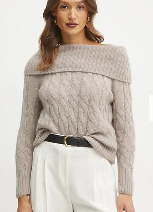 Стильний жіночий светр італійського бренду Marella з лінії Monochrome. ✔ Модель з об’ємною косичкою та широким відворотом, який красиво відкриває лінію плечей. ✔ М’яка фактурна пряжа з вмістом вовни та альпаки дарує комфорт і тепло. ✔ Нейтральний бежево-сірий відтінок легко поєднується з базовим гардеробом. ✔ Ідеальний варіант як для щоденних луків, так і для вечірніх образів. 50 % Альпака, 28 % Поліамід, 22 % Вовна