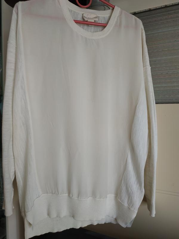 Кофтинка масляного кольору з опущеним рукавом, перед шовковий, все інше тоненька в'язана бавовна з вовною. Під руками 54, довжина 65, рукав від горловини 70