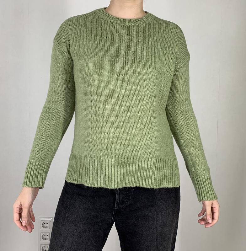 Светр зеленого кольору Розмір S 100% акрил Довжина 61 см, довжина рукава від горловини 72 см, напівобхват грудей 51 см Стан ідеал Вдягнуто на розмір Л, зріст 167