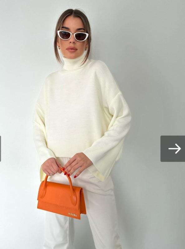 Стильный, тёпленький, мягкий гольфик молочного цвета Кремовый свитер оверсайз Размер указан s Пог 55 Полуобхват низа 55 Рукав 50 Плечи приспущены 52 Длина 49 Длина рукава от горловины 70