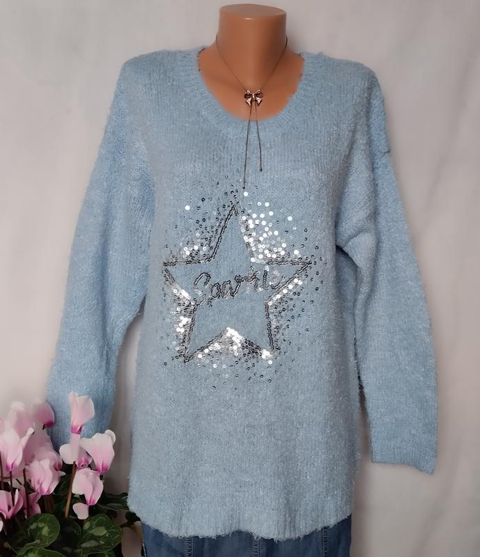 Шикарный свитер, связанный из пряжи "травка", очень мягкий, пушистый нежного голубого цвета. Спереди украшен пайетками. Замеры: длина 68 рукав от горловины 75 пог 54-78 пост 56-80 низ 58-80, хорошо тянется