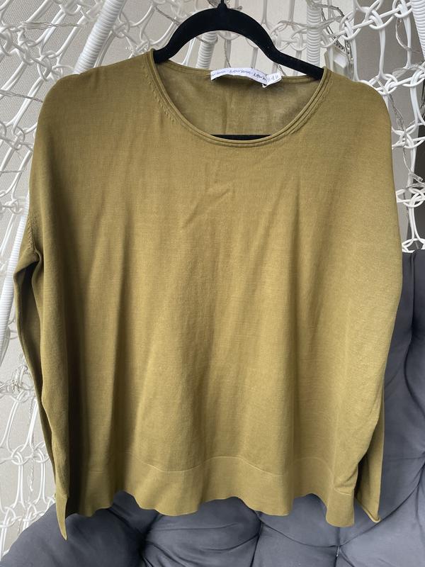 Стильний светр, що вписується у будь-який гардероб, склад ідеальний - 100% котон По бірці розмір S, але сміло мода на М Гарний оливковий колір- на хвилі цього сезону та наступного Виріб має оверсайзний крій та приспущене плече ПОГ 64 Довжина 62 Рукав 54 ( ширина 12)