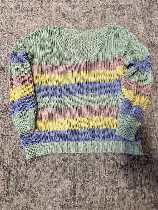 Розвантажую шафу. Мій розмір М. Светр в полоску, вільного крою. Кофта рожева по бірці s, вкорочена, на довгий рукав, з декольте. Ціна вказана за дві одиниці