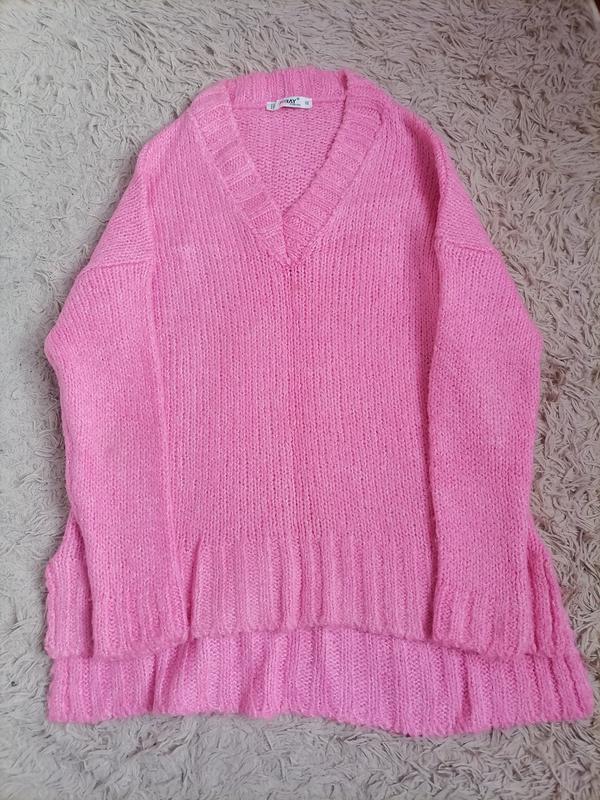 Жіночий светр рожевого кольору б/у. По боках розрізи. Ног - 53 см (тягнеться), рукав приспущений - 44 см, довжина - 59-65 см.