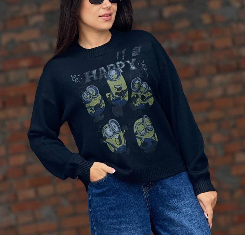 😍 Крутий мультяшний светрик МІНЬЙОН М'якенький та приємний на дотик Має спереду мультяшних міньйонів, що доповнені камінцями. В ньому ви будете відчувати тепло і комфорт. ✂️Матеріал: кашемір ⭐️Гарної якості . 🏷 Розміри: універсальний 42-48. Параметри моделі : 87-74-94 Зріст 169см Виміри: Довжина виробу - 56 см. Довжина рукава - 52 см. Ширина плечей - 56 см. НОГ - 54 см. Низ - 52 см.