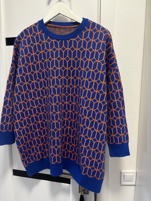 синій светр з помаранчевим геометричним візерунком.