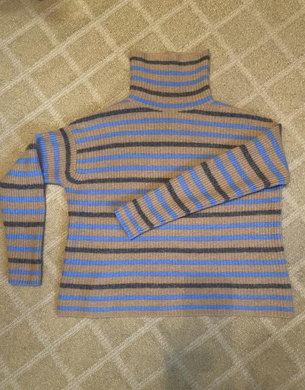 Щільний бежевий светр в блакитну та сіру смужку з вовни 70% та кашеміру 30%. ОГ-55, довжина - 53, плечі спущені-53, рукав від плечового шву-47. Без недоліків.