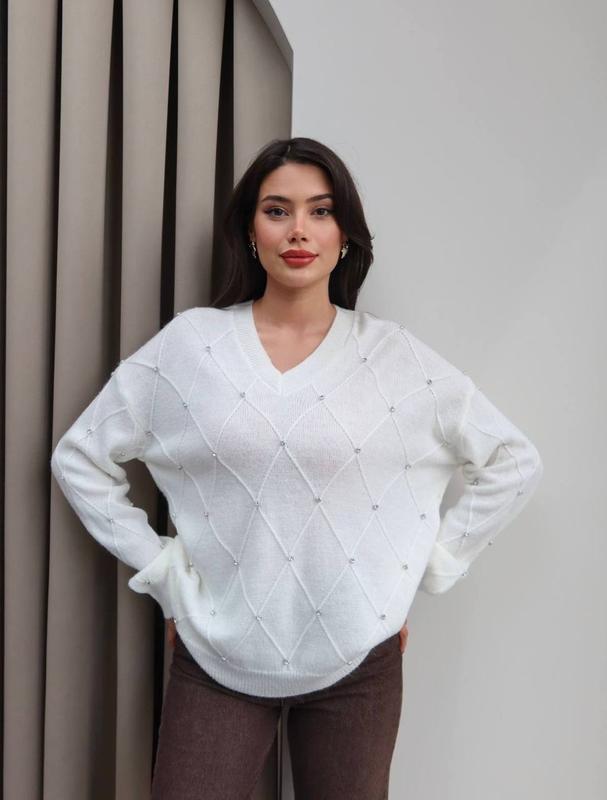 Светр Модель 2427 Розмір універсальний 42/52 Машинна вʼязка Виробник Туреччина 🇹🇷 Кольор: молочний , сірий ОГ-60 см Довжина по спинці - 64 см Довжина рукава від ворота- 73 см Похибка замірів на трикотажних речах +-2-3см Дуже приємна до тіла вʼязка, камінці прибиті, висока якість та неймовірний комфорт та стиль