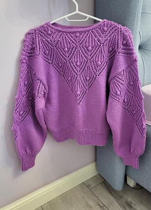 В'язана кофта, ручна робота, дуже гарні об'ємні рукава. Тепла, в нитці точно є домішок вовни, але точний склад не підкажу. Підійде га розмір XS-S. рукав спущений: 45 см пог: 50 см довжина: 55 см
