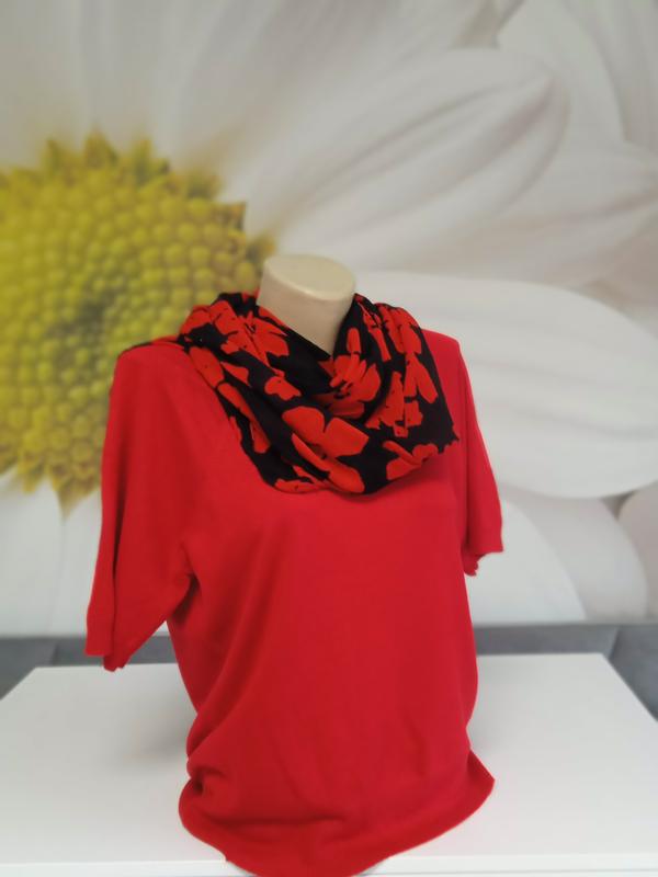 Класична однотонна кофтинка з коротким рукавом насичено червоного кольору. Легка та зручна. Приємна на дотик. Гладка машинна в'язка. Нитка середньої товщини. Стрейч. Лягає по фігурі. Акуратний виріз. Стильно виглядає з шарфом в тон у комплекті (шарф може бути замінений, але в кольорі). Є розміри. 50р на пог-52-54 48р на пог-50-52 46р на пог-48-50
