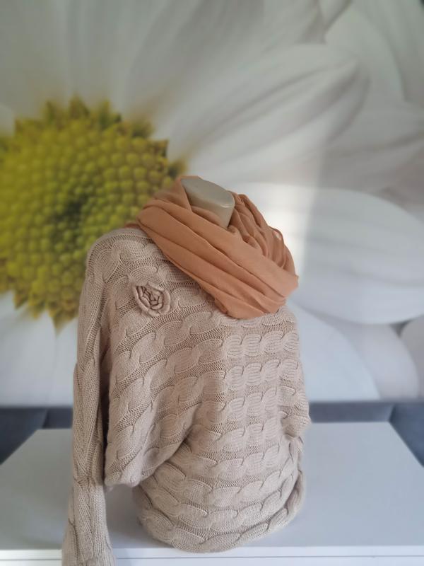Классическая однотонная кофтонка приятного цвета кофе с молоком. Теплая и удобная. Приятная на ощупь. Фактурная машинная вязка. Толстовка нить. Стрейч. Ложится по фигуре. Фасон-легкая летающая мышь. Аккуратный вырез Стильно смотрится с шарфом в тон в комплекте (шарф может быть заменен, но в цвете). Есть размеры. 48р на пог-50-52 46р на пог-48-50 44р на пог-46-48