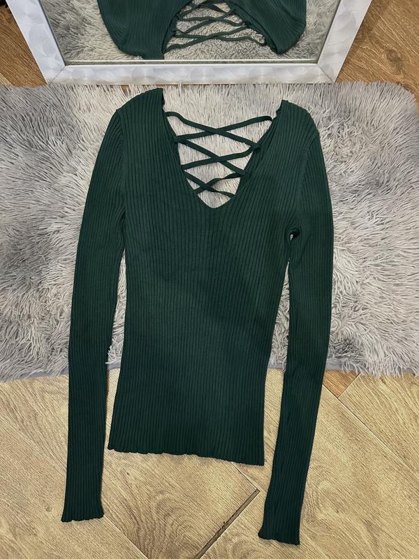 Стильна зелена кофта Miss Selfridge 💚 Облегающая трикотажная кофта из мягкой ребристой ткани. Имеет оригинальный вырез на груди с перекрестными завязками ззади, что добавляет женственности и акцентирует фигуру. Длинные рукава, эластичная ткань хорошо тянется.