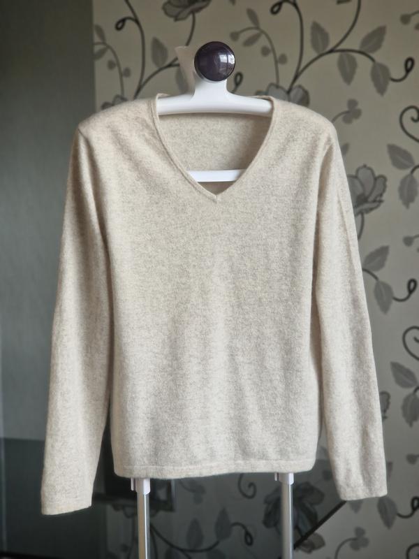 Кашеміровий, теплий, м'який, приємний на дотик светр з V-подібним вирізом. В районі ліктів светр задекорований вставками з натуральної шкіри темно-коричневого кольору. Ног-49см, рукав-62см, довжина-63см.
