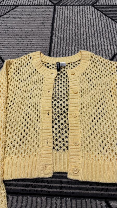 Кардиган розмір xxs, підійде на xs. Має теплий жовто-персиковий колір. Матеріал: 100% акрил