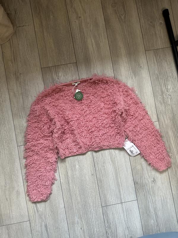 светр рожевого кольору має цікаву текстуру, виглядає як барашка вкорочений, розмір хс - с новий, має всі бірочки