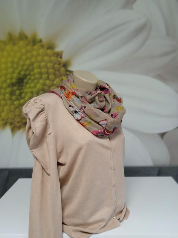 Класична однотонна кофтинка з довгим рукавом приємного кольору кави з молоком. Легка та зручна. Приємна на дотик. Гладка машинна в'язка. Нитка середньої товщини. Тягнеться з легкістю. Лягає по фігурі. На гудзичках. Акуратний виріз. Стильно зібрана по плечах. Гарно виглядає з шарфом в тон у комплекті (шарф може бути замінений, але в кольорі). Є розміри. 50р на пог-54-56 48р на пог-52-54