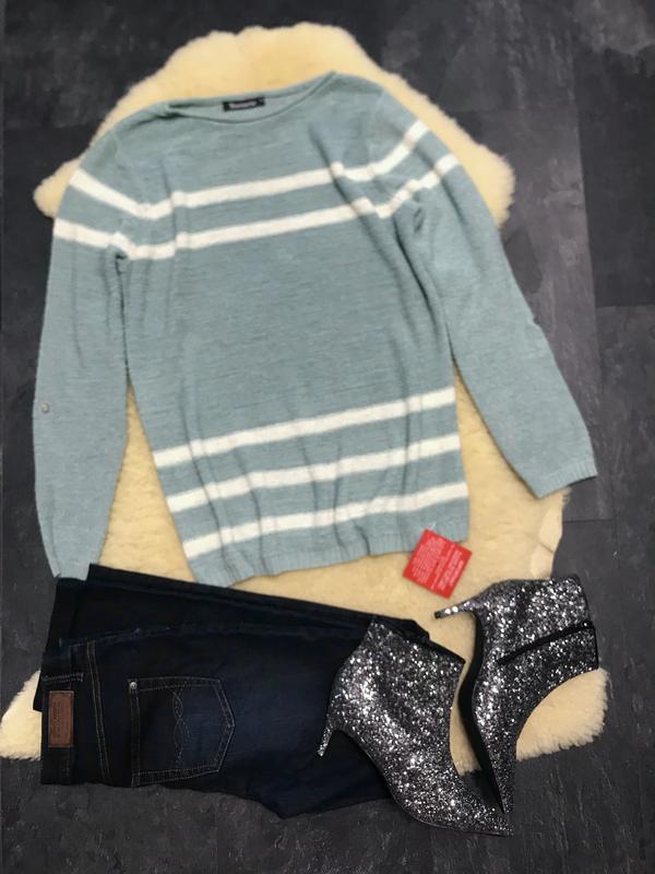 Джемпер Bonmarche с рукавами трансформер с перламутровыми пуговицами Цвет серо-голубой с белыми полосами Размер - М Новый длина- 73 см ПОГ - 55 см , ещё тянется на. 5 см Рукав от шва - 65 см
