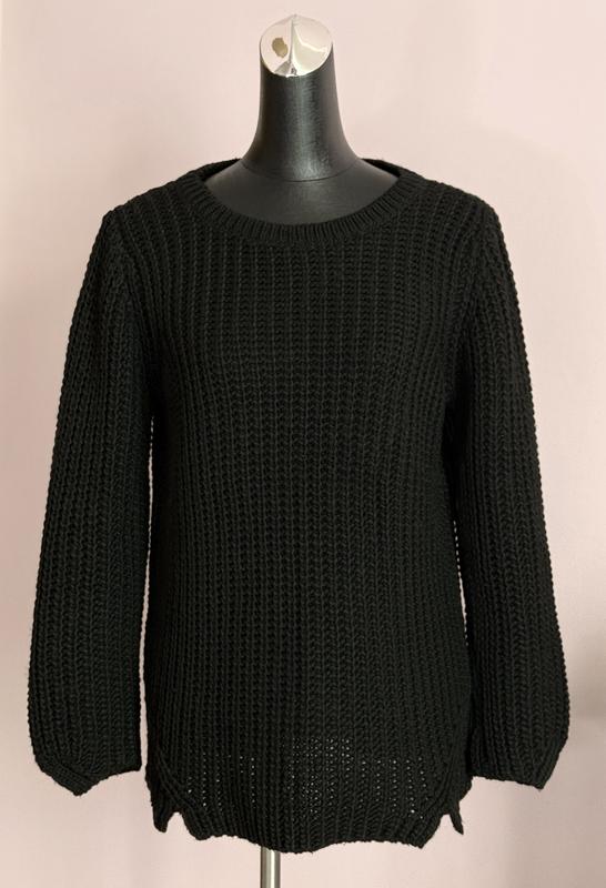 Чорний светр грубого в'язання від бренда H&M. Дуже теплий, у складі є вовна, фасон подовжений — прикриває стегна. Стан чудовий, без нюансів. Розмір М, заміри плечі 41 см, рукав від горловини 72-73 см, пахви 50 см, довжина 70 см.
