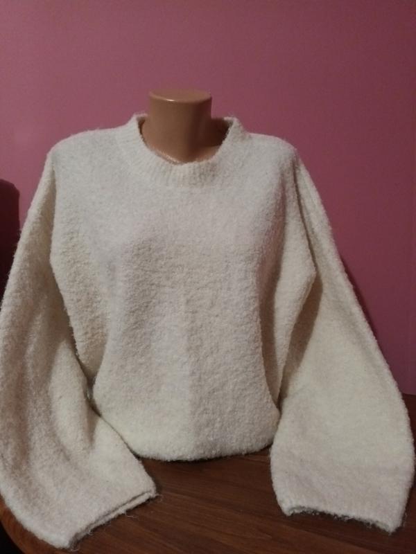 Дуже гарний светр , у складі 20% вовни букльована нитка. Затишний. м'ягенький светрик. Напівохват груді 60 см Довжина 55 см. Довжина рукава від плеча 49 см. віл шиї 70 см. Рукав спущений