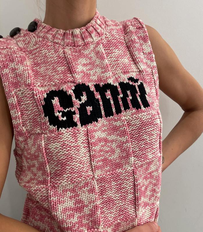 Жилет Ganni в чудовому стані, оригінал, made in Italy. Модель выполнена в нежных разно-меланжевых оттенках с фактурной вязкой и контрастным логотипом GANNI спереди. Декоративные пуговицы на плече добавляют модный акцент. Отлично подходит для многослойных образов - с рубашками, лонгслив или в качестве самостоятельного элемента. Размер - S/M 55% Cotton 45% Polyamid Замеры: Ширина между плечами - 34 см ПОГ - 43 см Довжи по спине - 53 см Ширина по низу - 40 см