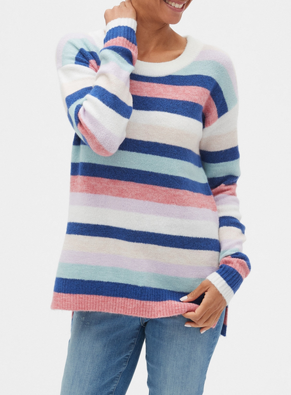 Очень мягкий, обьемный женский свитер туника в разноцветную полоску GAP Мягкий трикотаж. Очень хорошо тянется, Длинные рукава с ребристыми манжетами и подолом. Боковые разрезы по низу. Ребристый круглый вырез горловины. Прямой силуэт, свободный крой. Длина ниже бедер. Состав Полиэстер 22%, спандекс 3%, акрил 75% На бирке указан размер Л . Обязательно ориентируйтесь только на замеры! длина спереди 70 см,длина сзади 73 см, длина рукава 54 см, ширина 54 см, плечо 17 см, плечи 58 см