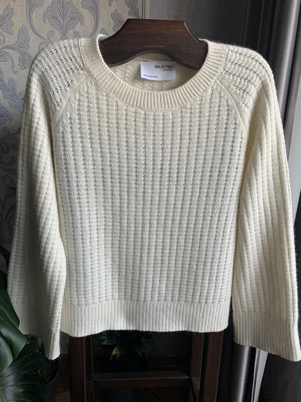 Обʼєм в грудях 114 Обʼєм в талії 110 Обʼєм низу 106 Рукав від горловини 70 Довжина 60 Неймовірно красивий, елегантний і водночас теплий та затишний светр вершкового кольору. Вʼязка щільна, але полотно на дотик мʼяке та ніжне. Завдяки наявності в складі не лише вовни, але і 8% альпака трішки пухнастий. Модель пряма вільного крою. Рукав-реглан прямий та широкий по всій довжині, що являється особливістю светра. Легкий в догляді, гарно переться в машині. Стан бездоганний, без жодних нарікань.