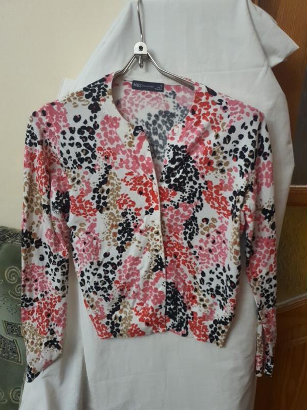 кофта- блуза жіноча трикотажна із довгим рукавом, по білому фоні різнокольорові плямкі, дуже весела і гарна, 49см плечі, 54см пог, 54см довжина, на гудзиках