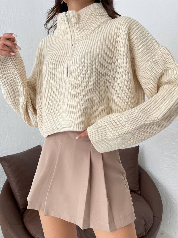Стильний жіночий вʼязаний укорочений светр на блискавці з коміром та довгими широкими рука...