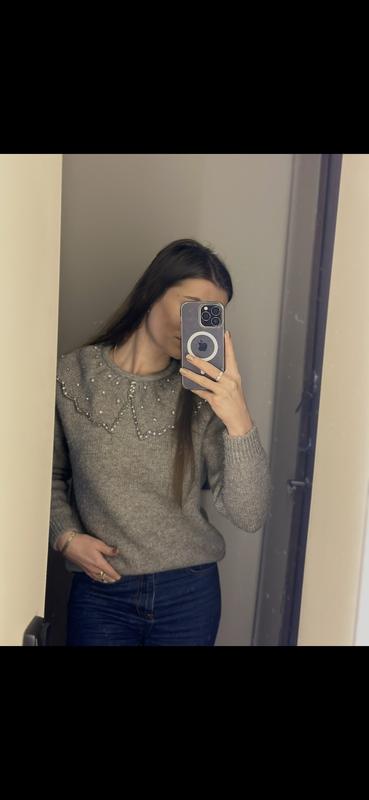 Свитер теплый вязаний с воротником со стразами, модный свитер , серый теплый свитер,кофта