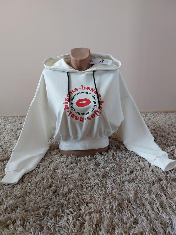Батник вкороченої модельки з капюшоном на затяжках. На рукавчиках та внизу виробу еластичні манжети. Доповнений принтом. Тканина приємна до тіла. Сезон: демісезон. Матеріал : трикотаж. Гарної якості Розмір 42/44: Довжина виробу - 48 см. Довжина рукава від коміра - 71 см. Напівобхват грудей - 62 см. Напівобхват низ - 38 см. Розмір 46/48: Довжина виробу - 50 см. Довжина рукава від коміра - 72 см. Напівобхват грудей- 64 см. Напівобхват низ - 38 см