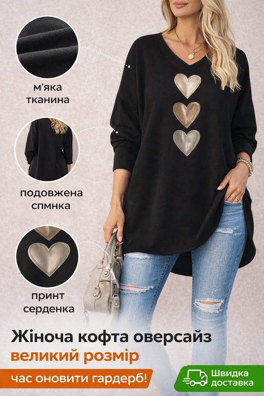 Вільний фасон (оверсайз) V-подібний виріз Довгий рукав Принт — сердечка Подовжена спинка, гарно сідає по фігурі Тканина середньої щільності, приємна до тіла Чудово поєднується з джинсами та легінсами Стан: нова Колір: чорний жіноча велика кофта з візерунком у вигляді сердець. Заміри виробу : Обхват грудей: 125–131 см Обхват талії: 110–116 см Обхват стегон: 135–141 см