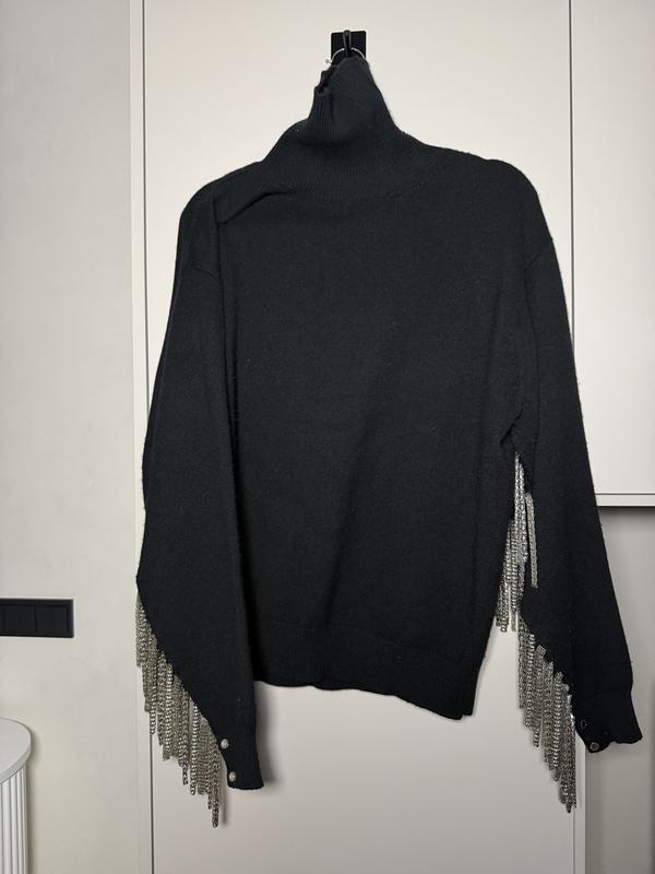 Оригінальний дизайнерський светр Christopher Kane. Модель виконана з м’якого чорного трикотажу, ключовий акцент — металеві ланцюжки-фрінжі вздовж рукавів. Декоративні ґудзики з брендингом на манжетах. Дуже ефектна, впізнавана річ у стилі luxury / avant-garde. Заміри: Довжина - 71 см Ширина - 60 см Довжина рукава - 64 см Матеріал: • 50% шерсть • 30% шовк • 20% кашемір