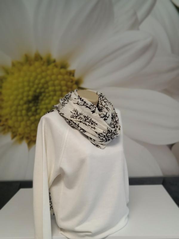 Класична однотонна кофтинка з довгим рукавом білого кольору. Тепла та зручна. Приємна на дотик. Гладка машинна в'язка. Нитка середньої товщини. Стрейч. Лягає по фігурі. Рукавчик -реглан. Закрита шия. Гарно виглядає з шарфом в тон у комплекті (шарф може бути замінений, але в кольорі). Є розміри. 50р на пог-54-56 48р на пог-52-54