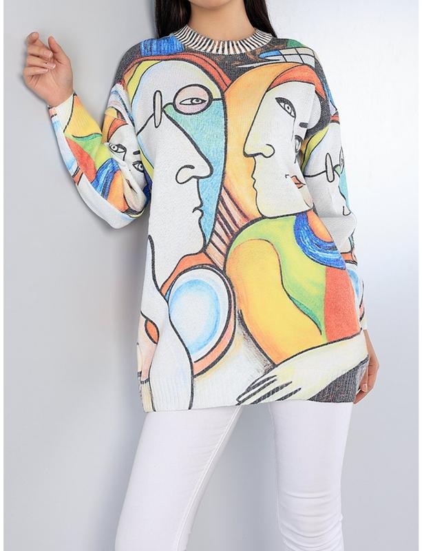 Очень яркий и заметный женский свитер. Изображение на нем - картина "Джон Леннон и Йоко Оно" Размер М-L (на L будет более вплотную). При необходимости пришлешь замеры Состав находится на фото Свитер полностью новый