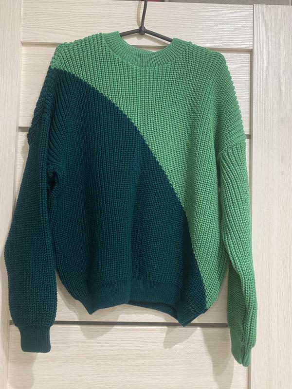 Теплий светр крупної вʼязки, дуже мʼякий і приємний до тіла. Гарні обʼємні рукави. Колір темний зелений та оливковий, з переді та ззаду однаковий. Всі заміри вказані на фото
