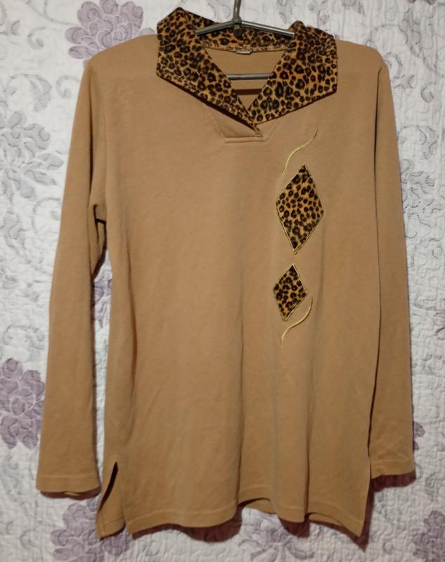 коричневая женская кофта или туника с длинными рукавами и леопардовым принтом на воротнике и декоративных элементах спереди. Она имеет V-образный вырез и небольшие разрезы по бокам внизу. Тип одежды: Кофта, свитер или туника. Цвет: Коричневый/бежевый с черно-коричневым леопардовым принтом. Детали: Леопардовый принт на воротнике, внутренняя сторона V-выреза и в виде двух ромбовидных аппликаций с вышивкой на груди. Стиль: Находки визуального поиска указывают на схожие модели в сегментах повседневной одежды, включая Леседельную одежду (modest fashion) или винтажный стиль 90-х. Этот предмет одежды можно сочетать с джинсами, брюками или юбками нейтральных тонов, чтобы леопардовый принт оставался центральным акцентом.